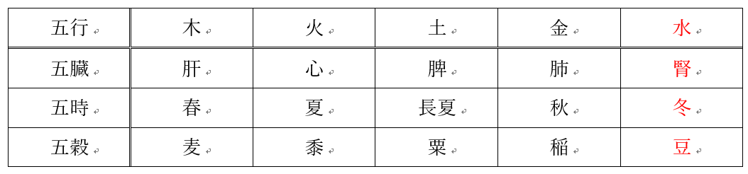 豆は五行色体表では「水」に分類されます。主に「冬」に収穫され、臓器では「腎」と深い関係があります。