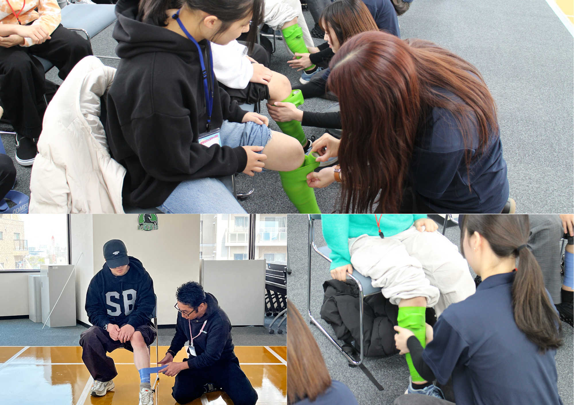 捻挫などの怪我をサポートするギプスや包帯固定を実践。