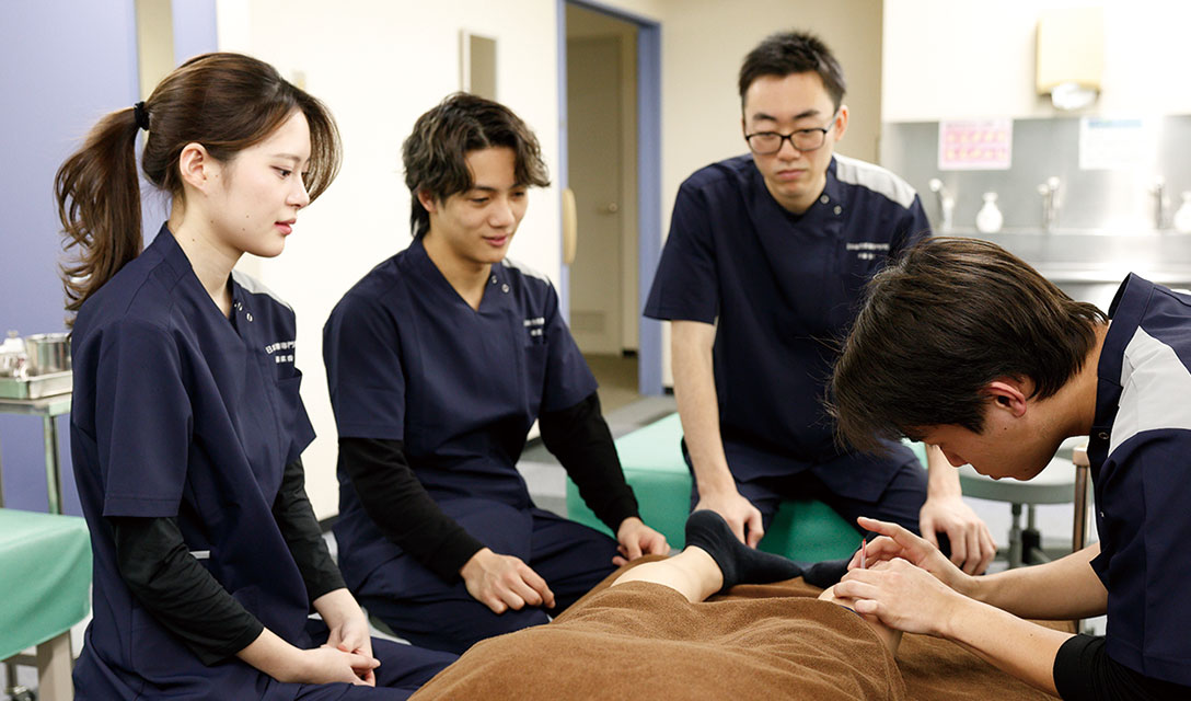 はり、きゅうの効果や仕組みについて学びます。知識を実技授業でアウトプットして確実な定着を目指します。